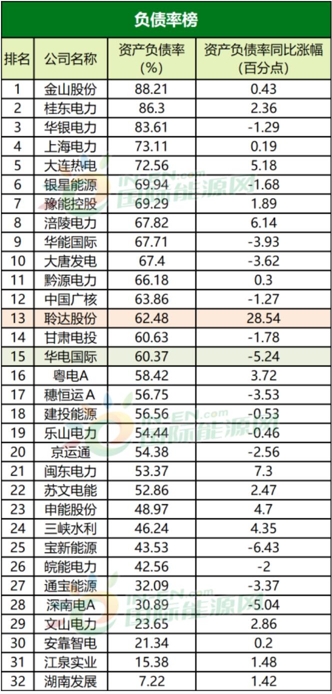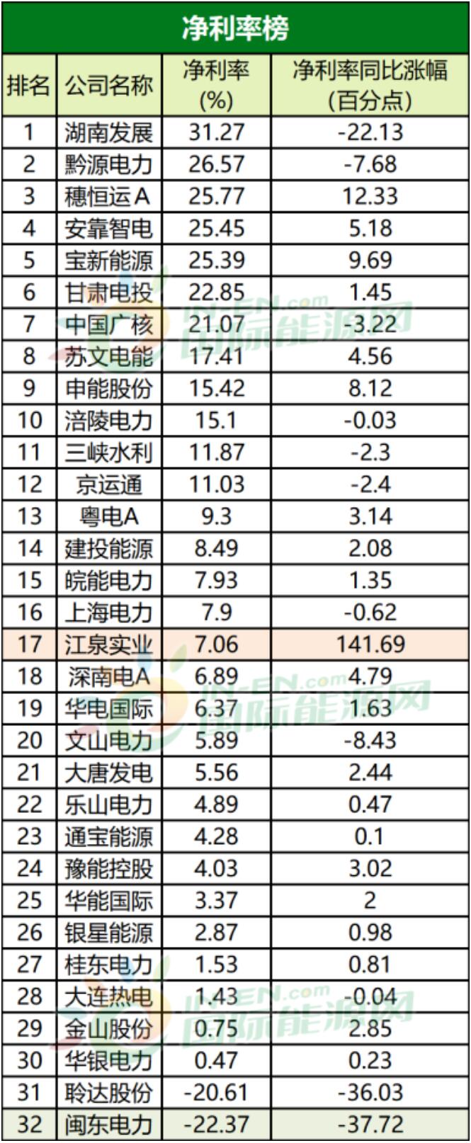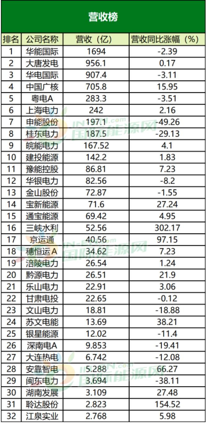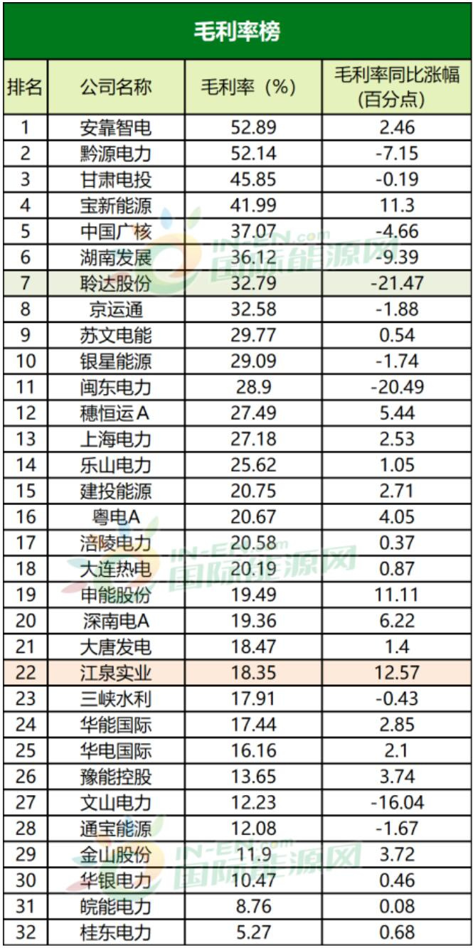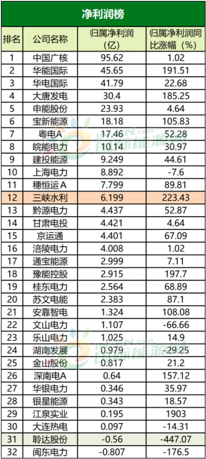 三峽水利雖然在歸屬凈利潤榜上僅僅排在第十二名,但從其同比的增速看,三峽水利的歸屬凈利潤增速是32家公司中最高的。另一家華能國際的歸屬凈利潤漲幅也非常高,這是因為公司通過研判煤炭市場走勢、優(yōu)化采購策略、區(qū)域供應(yīng)結(jié)構(gòu),加強(qiáng)與重點供應(yīng)商合作的力度。節(jié)約了煤炭的成本,在供熱領(lǐng)域業(yè)務(wù)增幅也是讓公司歸屬凈利潤大幅增加的重要原因。