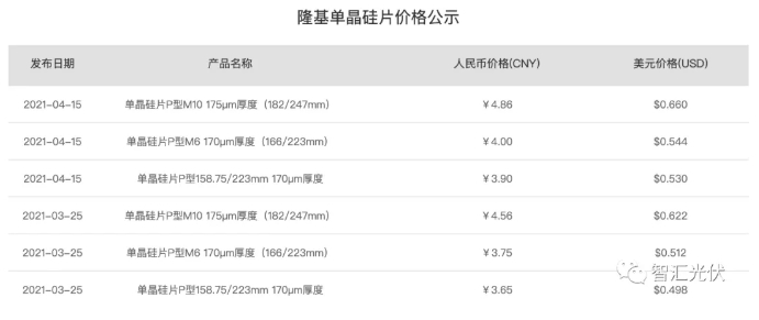 整個(gè)4月份,光伏原材料端“漲勢(shì)愁人”,行業(yè)里又傳來(lái)爆炸消息,另一單晶硅片龍頭隆基股份也上調(diào)了硅片價(jià)格2.5~3毛/片,如下圖所示。