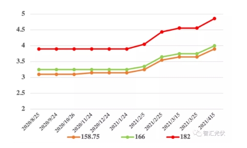 從上圖可以看出,從去年8月底至今,不同尺寸的硅片價(jià)格已經(jīng)上漲了24%左右。而相對(duì)于2020年6~7月份最低點(diǎn)的價(jià)格,不同尺寸上漲超過(guò)50%!