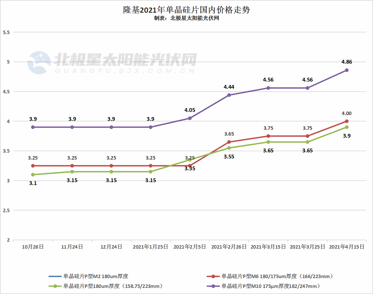 漲價(jià)繼續(xù)向下傳導(dǎo),4月15日隆基公布最新單晶硅片報(bào)價(jià),G1、M6、M10價(jià)格全線上漲,最高漲幅6.8%;4月10日另一大單晶硅片巨頭中環(huán)股份同樣上調(diào)G12、M6、G1全部報(bào)價(jià),最高漲0.3元/片。