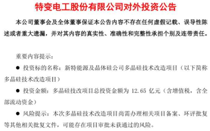 公告內(nèi)容顯示,特變電工擬投資12.65億元,用于多晶硅技改項(xiàng)目,投資標(biāo)的為旗下子公司新特能源及晶體硅公司技術(shù)改造項(xiàng)目。其中3萬噸多晶硅生產(chǎn)線技術(shù)改造項(xiàng)目投資金額4.70億元,3.6萬噸多晶硅生產(chǎn)線技術(shù)改造投資金額7.95億元。