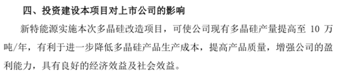 此外,公告中也提到,在本次新特能源實(shí)施本次多晶硅改造項(xiàng)目完成后,可使公司現(xiàn)有多晶硅產(chǎn)量提高至10萬噸/年,有利于進(jìn)一步降低多晶硅產(chǎn)品生產(chǎn)成本,提高產(chǎn)品質(zhì)量,增強(qiáng)公司的盈利能力,具有良好的經(jīng)濟(jì)效益及社會效益。