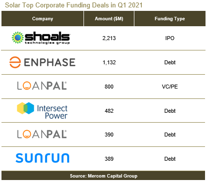 2021年第一季度,融資規(guī)模最大的是Shoals Technologies Group通過IPO籌集的22億美元。此外,Enphase Energy籌集了11億美元,Loanpal籌集了8億美元;Intersect Power獲得融資4.82億美元;Loanpal的3.9億美元證券化交易,Sunrun融資3.89億美元。