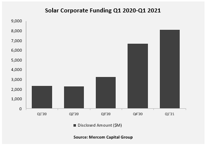 2021年第一季度,全球企業(yè)太陽能總?cè)谫Y(包括風(fēng)險(xiǎn)資本融資,公開市場(chǎng)和向太陽能行業(yè)的債務(wù)融資)達(dá)到81億美元,總計(jì)36筆交易,比2020年第四季度43筆交易的67億美元增長(zhǎng)了21%。
