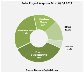 此外,今年一季度全球有20筆太陽能并購(gòu)交易,而2020年第一季度有12筆交易。2021年第一季度宣布的20筆太陽能并購(gòu)交易中,有15筆涉及太陽能下游公司,其次是3家系統(tǒng)平衡(BOS)公司。