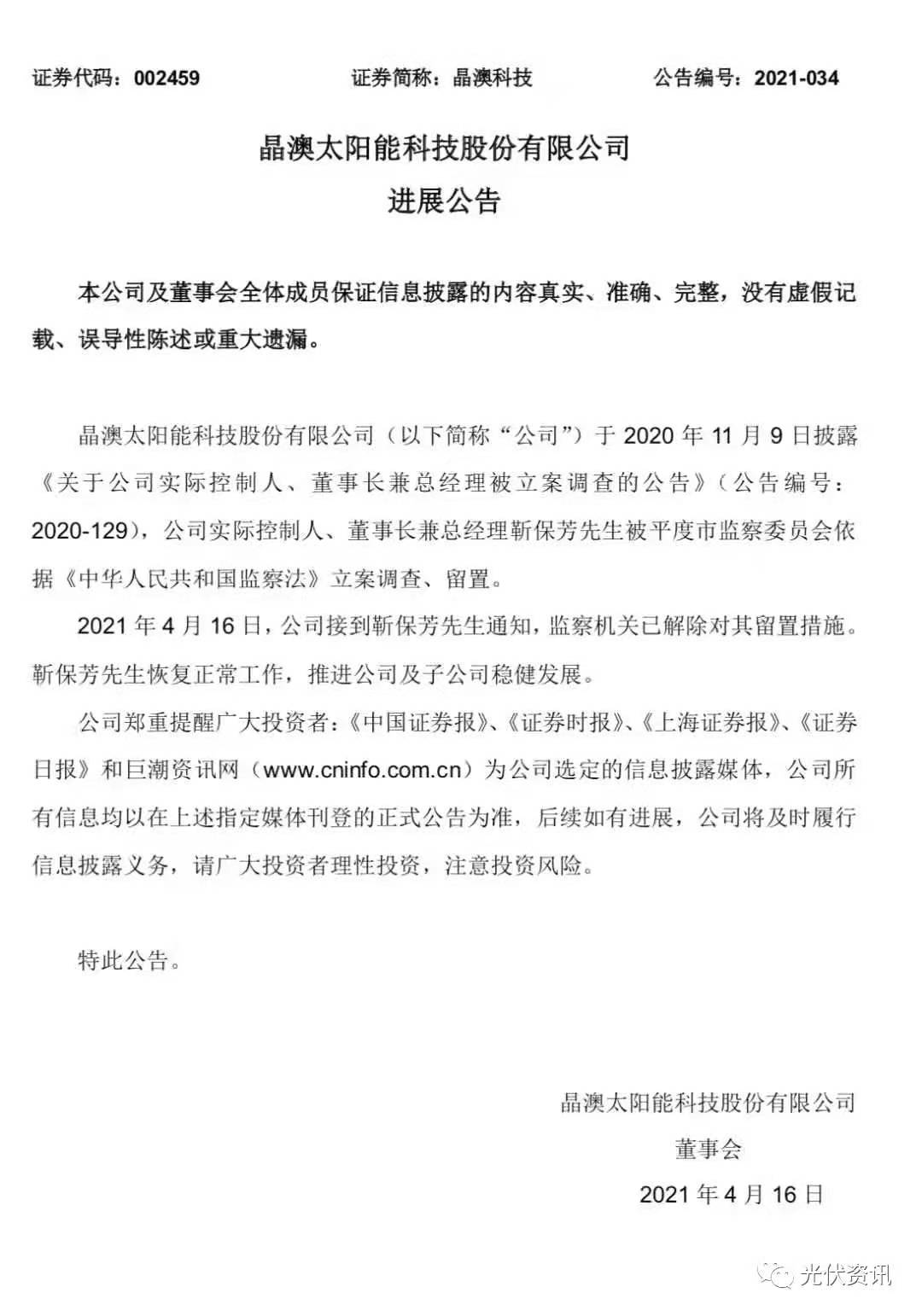 2021 年 4 月 16 日,公司接到靳保芳先生通知,監(jiān)察機(jī)關(guān)已解除對(duì)其留置措施。靳保芳先生恢復(fù)正常工作。