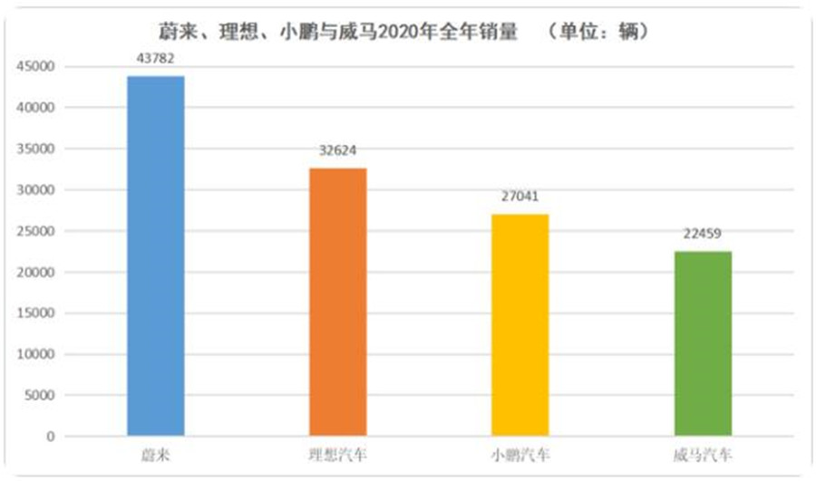 蔚來、理想、小鵬與威馬2020年全年銷量,數(shù)據(jù)來源于乘聯(lián)會,連線出行制圖