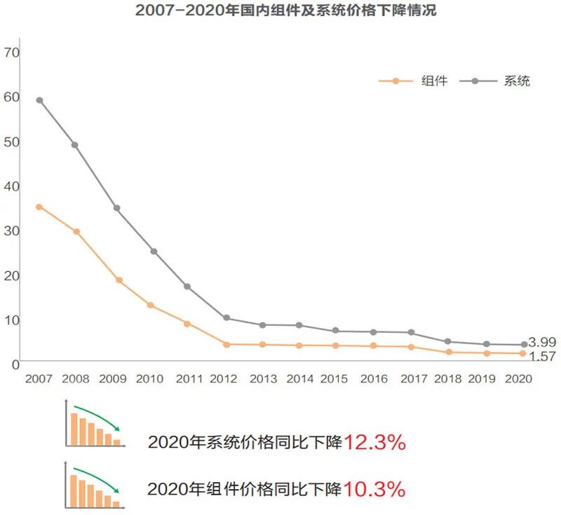 過去多年來,我國光伏產(chǎn)業(yè)成本大幅下降。在越來越多的國家和地區(qū),光伏電價(jià)已經(jīng)低于火電電價(jià),成為最具競爭力的電力產(chǎn)品。根據(jù)中國光伏行業(yè)協(xié)會(huì)的統(tǒng)計(jì),2011年-2020年,光伏系統(tǒng)價(jià)格下降超過4.3倍,組件價(jià)格下降超過5.7倍,2021年,我國已經(jīng)全面進(jìn)入平價(jià)時(shí)代。