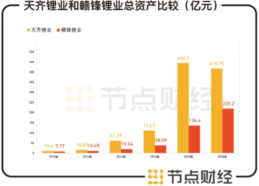 在2010年上市之初,天齊鋰業(yè)和贛鋒鋰業(yè)兩家公司的規(guī)模都很小,總資產(chǎn)不過才10.4億元、7.77億元。截至2020年末,兩家公司的總資產(chǎn)已達(dá)到418.75億元、220.2億元,規(guī)模漲幅超過40倍、28倍。