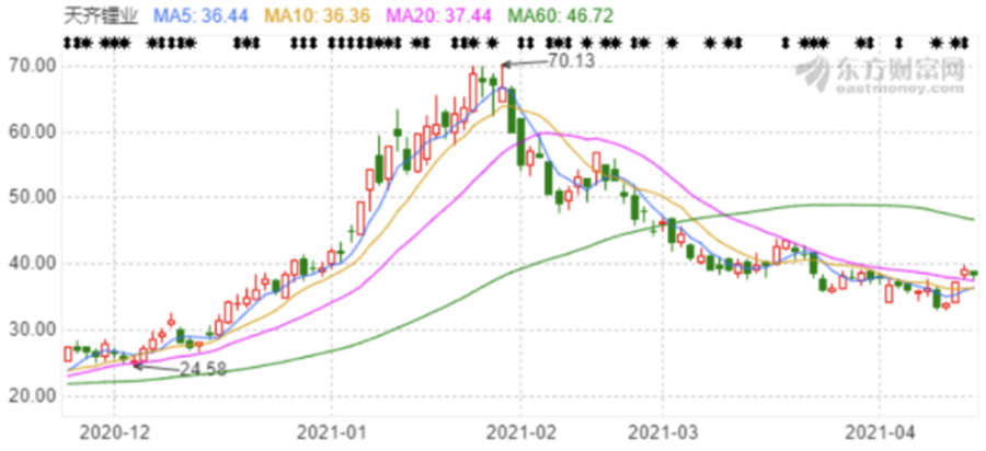體現(xiàn)在天齊鋰業(yè)和贛鋒鋰業(yè)的業(yè)績上,正如前文所述,二者2020年及2021年一季度凈利潤均實(shí)現(xiàn)同比大幅增加,股價(jià)亦同步上行,在1月底達(dá)到70.13元/股,149.3元/股,而在一季報(bào)公布后的4月14日,二者股價(jià)分別大漲10%、9.27%。