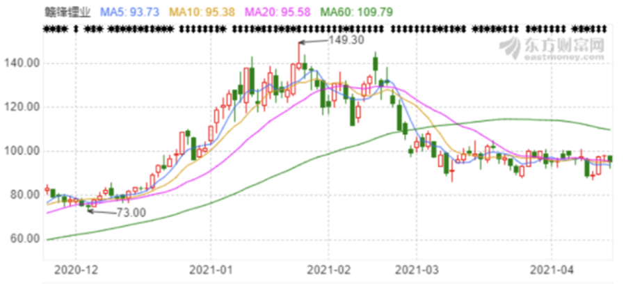 據(jù)公告顯示,2021年一季度,贛鋒鋰業(yè)預(yù)計(jì)盈利4.5億元-5.1億元,相比2020年一季度的774.61萬元,同比增長5709.38%-6483.96%。