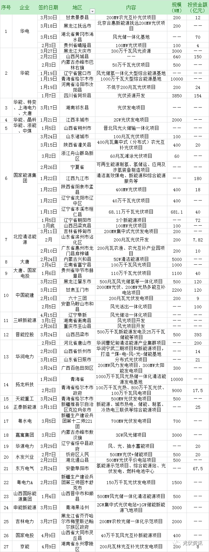 華能以20GW的總規(guī)模位居投資榜榜首,占據(jù)第一季度總投資規(guī)模的30%,投資金額超300億元:1月7日,阿壩縣人民政府與華能四川水電有限公司簽約光伏資源開發(fā)合作協(xié)議,該項(xiàng)目協(xié)議投資154億元,總裝機(jī)規(guī)模385萬千瓦;1月19日,華能集團(tuán)在青海省格爾木市簽訂1000萬千瓦的大型綜合能源基地建設(shè)戰(zhàn)略合作協(xié)議;同日,又與遼寧營口市政府簽署大型綜合能源基地戰(zhàn)略合作協(xié)議;1月21日,攜手晶科與江西省豐城市成功簽訂了2GW光伏項(xiàng)目投資合作協(xié)議;與內(nèi)蒙古巴林右旗簽訂風(fēng)光氫儲項(xiàng)目合作,規(guī)劃建設(shè)100萬千瓦風(fēng)電儲能電站,50萬千瓦光伏發(fā)電項(xiàng)目……據(jù)光伏資訊了解,2020年華能實(shí)現(xiàn)新增新能源裝機(jī)突破1000萬千瓦,開工超1000萬千瓦。同時,華能黨組書記、董事長、中國工程院院士舒印彪提出“十四五”期間華能要干8000萬到1億千瓦的清潔能源,初步估算新能源調(diào)整的投資力度在7000億人民幣左右,這是目前各大央企在官方提出的十四五最大能源規(guī)劃。