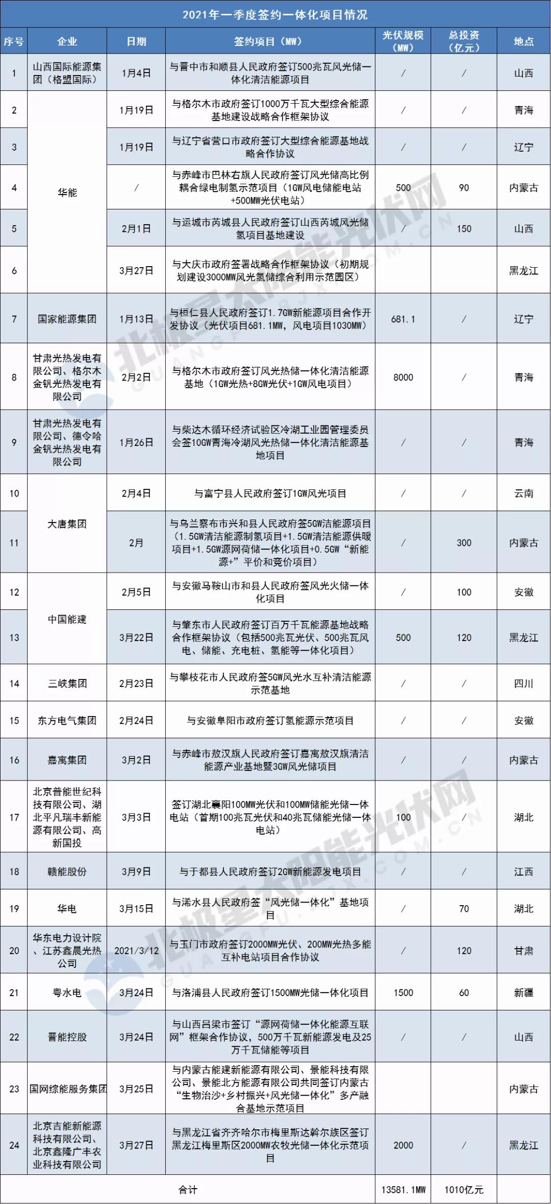 此外,僅2021年一季度,一體化項(xiàng)目簽約數(shù)量已達(dá)24個(gè),裝機(jī)規(guī)模超48.8GW,簽約總額1010億元,五大發(fā)電新能源競爭激烈。詳情如下表: