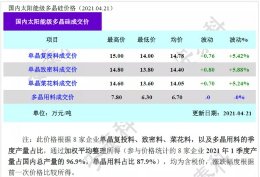 根據(jù)硅業(yè)分會(huì)21日公布的最新硅料價(jià)格監(jiān)測(cè)顯示,本周多晶硅價(jià)格延續(xù)漲勢(shì),國內(nèi)單晶復(fù)投料價(jià)格區(qū)間在140-150元/kg,成交均價(jià)為147.8元/kg,周環(huán)比上漲5.42%。