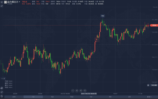 早盤開盤,動(dòng)力煤延續(xù)昨日夜盤強(qiáng)勢(shì)漲勢(shì),開盤一度漲逾5%,隨后震蕩上升,盤中一度觸及752元/噸的高位,幾近漲停,主力合約收盤漲5.66%, 收于750.8元/噸。