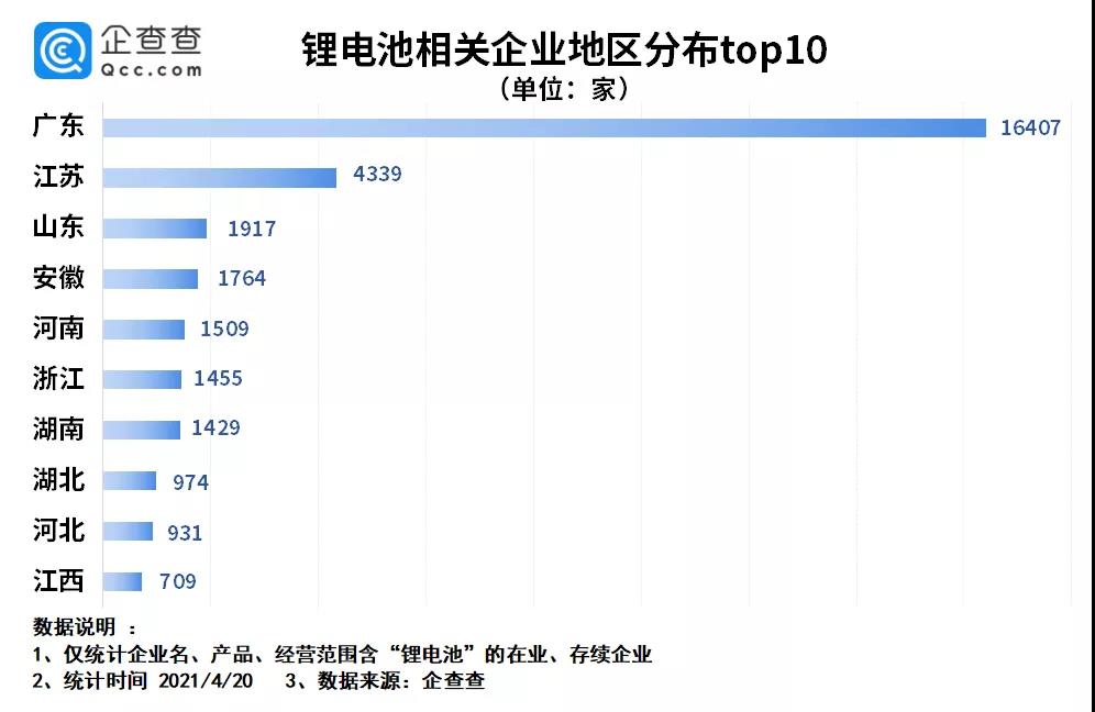 從地區(qū)分布來(lái)看,企查查數(shù)據(jù)顯示,目前廣東省以1.64萬(wàn)家鋰電池相關(guān)企業(yè)數(shù)量高居全國(guó)第一,江蘇、山東分別以4339家、1917家企業(yè)位列二三名。此外,安徽、河南、浙江、湖南等省份同樣躋身前十。
