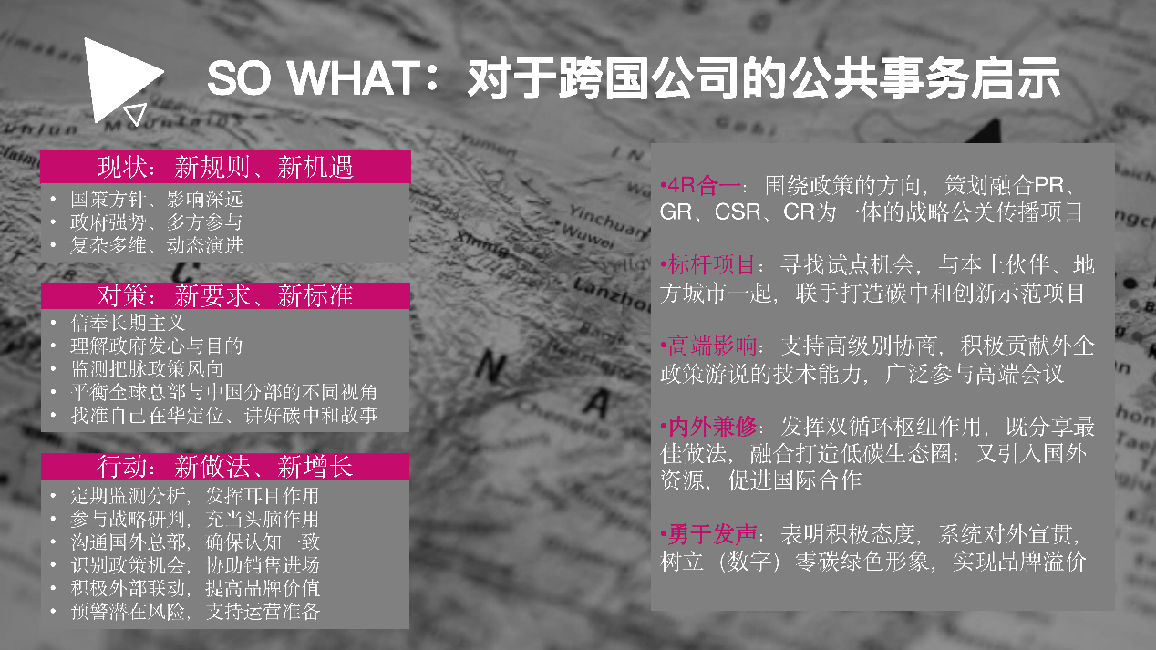 三位演講嘉賓從議題專家、行業(yè)實踐者和專業(yè)服務者的不同視角出發(fā),深入淺出地勾畫了碳中和的政策圖景與行業(yè)趨勢,剖析了外企所面臨的現(xiàn)實挑戰(zhàn)與潛在機會,并就企業(yè)如何通過強化政府關系與公共關系借力碳中和給出了獨到的見解。