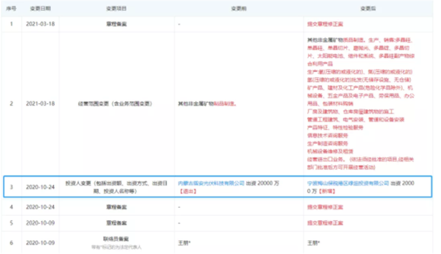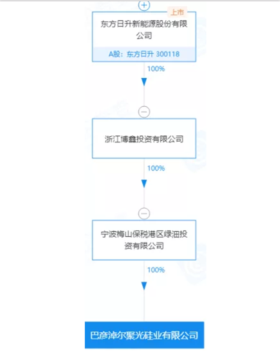 2020年10月24日,聚光硅業(yè)投資人發(fā)生變化,內(nèi)蒙古盾安光伏科技有限公司退出,寧波梅山保稅港區(qū)綠沺投資有限公司出資2億元“拿下”聚光硅業(yè)。后者為浙江博鑫全資控股公司,浙江博鑫為東方日升全資公司。此時(shí),東方日升進(jìn)軍多晶硅領(lǐng)域消息坐實(shí),正式踏入行業(yè)上游領(lǐng)域。