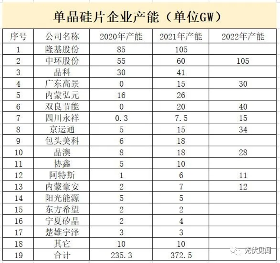 最近統(tǒng)計(jì)了國(guó)內(nèi)單晶硅片產(chǎn)能,據(jù)不完全統(tǒng)計(jì),2020年國(guó)內(nèi)單晶硅片產(chǎn)能在235GW左右,2021年國(guó)內(nèi)單晶硅片產(chǎn)能按照各公司規(guī)劃將增加到372.5GW左右。