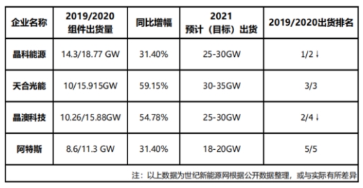 2021年,各家企業(yè)在2020年出貨量的基礎(chǔ)上相繼調(diào)高出貨目標(biāo)。相關(guān)材料顯示:晶科在2021年預(yù)計(目標(biāo))出貨量為25-30GW,相較2020年增長33.2%-59.8%;天合預(yù)計(目標(biāo))出貨量30-35GW,相較2020年增長88.5%-119.95;晶澳預(yù)計(目標(biāo))出貨量25-30GW,相較2020年增長57.4%-88.9%;阿特斯預(yù)計(目標(biāo))出貨量18-20GW,相較2020年增長59.3%-77%。