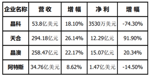 從晶科、天合、晶澳、阿特斯年報不難發(fā)現(xiàn),各家營收額全面上浮。晶科營收晶科營收53.8億美元(約合352.6億元人民幣),同增18.10%;天合營收294.18億,同增26.14%;晶澳營收258.47億,同增22.17%;阿特斯?fàn)I收34.76億美元(約合227.5億元),同增8.62%。