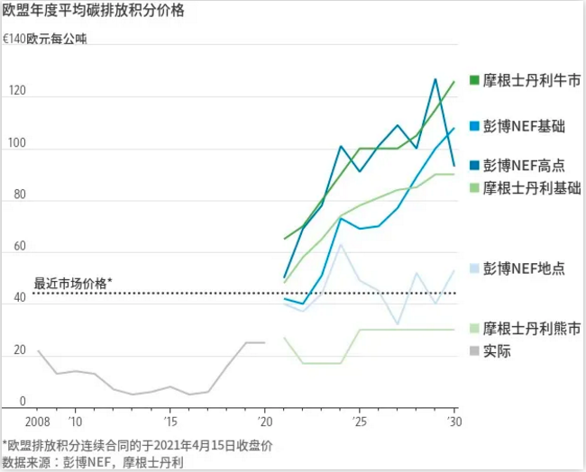 歐盟的可交易碳排放積分是今年表現(xiàn)最好的大宗商品之一,到目前為止價(jià)格累計(jì)上漲超36%,在46歐元左右。大摩分析師甚至看漲碳價(jià)在2030年漲破120歐元。