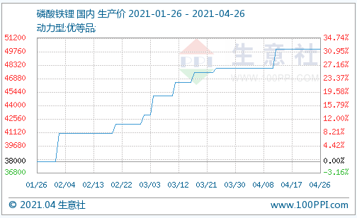 根據(jù)生意社監(jiān)測的數(shù)據(jù)顯示,截止4月26日國內(nèi)動(dòng)力型優(yōu)等品磷酸鐵鋰均價(jià)在50000.00元/噸,近期磷酸鐵鋰漲勢放緩,4月份整體漲幅4.17%,漲幅為2000元/噸,上游碳酸鋰供不應(yīng)求的狀態(tài)也得到了緩解,2020年以來隨著全球經(jīng)濟(jì)的發(fā)展,環(huán)保意識(shí)不斷增強(qiáng),新能源電池產(chǎn)業(yè)發(fā)展迅速磷酸鐵鋰憑借其優(yōu)異的性能與制造成本的優(yōu)勢,成為了主流的發(fā)展方向。