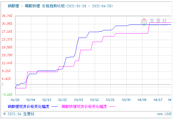 據(jù)生意社統(tǒng)計(jì),2021年1月初-4月末的整體價(jià)格上漲35.14%,漲幅達(dá)到13000元/噸,2021年1月初磷酸鐵鋰的價(jià)格37000元/噸,到1月末價(jià)格上漲到38000元/噸,整體價(jià)格上漲了2.7%,漲幅為1000元/噸,2月初磷酸鐵鋰的價(jià)格由38000元/噸漲到42000元/噸,相比1月初價(jià)格上漲了13.51%,漲幅達(dá)到5000元/噸,相比2月初價(jià)格上漲了10.53%,漲幅達(dá)到4000元/噸,3月初磷酸鐵鋰的價(jià)格由43000元/噸,呈現(xiàn)階梯式增長達(dá)到48000元/噸,3月漲幅11.63%,相比1月初價(jià)格上漲了29.73%,相比2月初價(jià)格上漲了26.32%,進(jìn)入4月份價(jià)格延續(xù)上漲走勢,4月份價(jià)格整體上漲4.17%,漲幅2000元/噸。