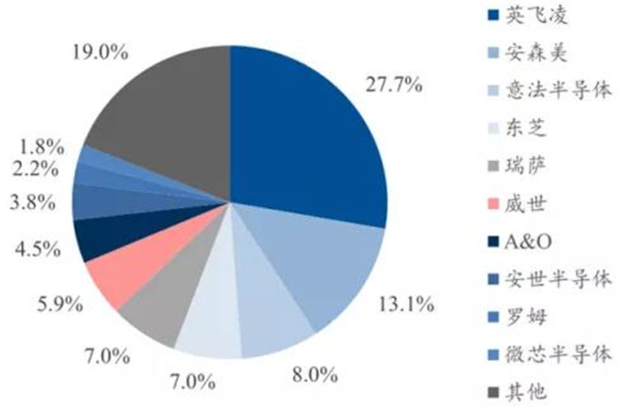 目前,分立IGBT器件領(lǐng)域的前五強(qiáng)占據(jù)全球該領(lǐng)域約70%的市場(chǎng)份額,它們分別是德國(guó)的英飛凌、美國(guó)的安森美、意大利和法國(guó)公司合并的意法半導(dǎo)體、日本的三菱和東芝。其中英飛凌獨(dú)占38.5%的銷售額,超出第二至第四名總和7個(gè)百分點(diǎn),在該領(lǐng)域具有毫無疑問的絕對(duì)控制地位。