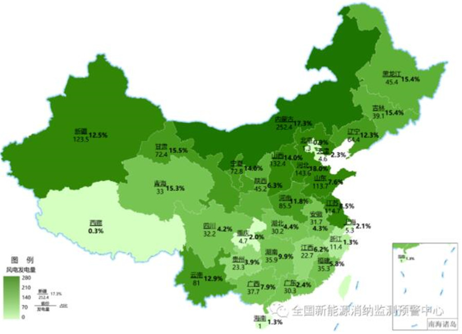 截至3月底各地區(qū)累計(jì)風(fēng)電發(fā)電量(億千瓦時(shí))及占本地區(qū)總發(fā)電量比重