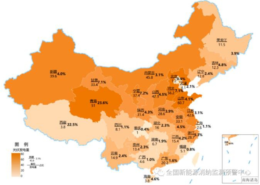 截至3月底各地區(qū)累計(jì)光伏發(fā)電量(億千瓦時(shí))及占本地區(qū)總發(fā)電量比重