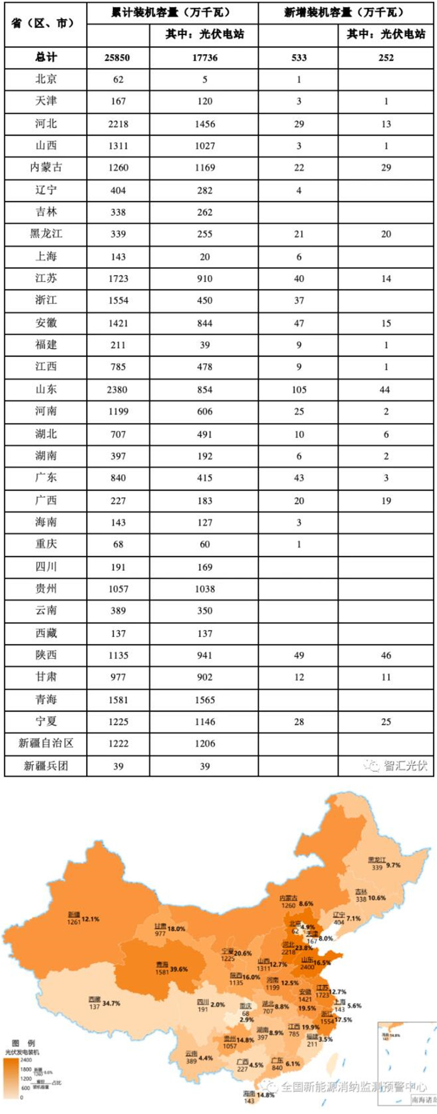 截至3月底,全國(guó)光伏并網(wǎng)裝機(jī)2.59億kW。全國(guó)各省新增、累計(jì)光伏裝機(jī)如下表所示。