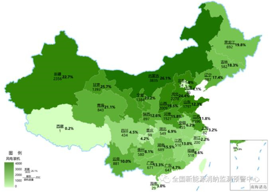 截至3月底各地區(qū)累計(jì)風(fēng)電裝機(jī)(萬(wàn)千瓦)及占本地區(qū)總裝機(jī)比重