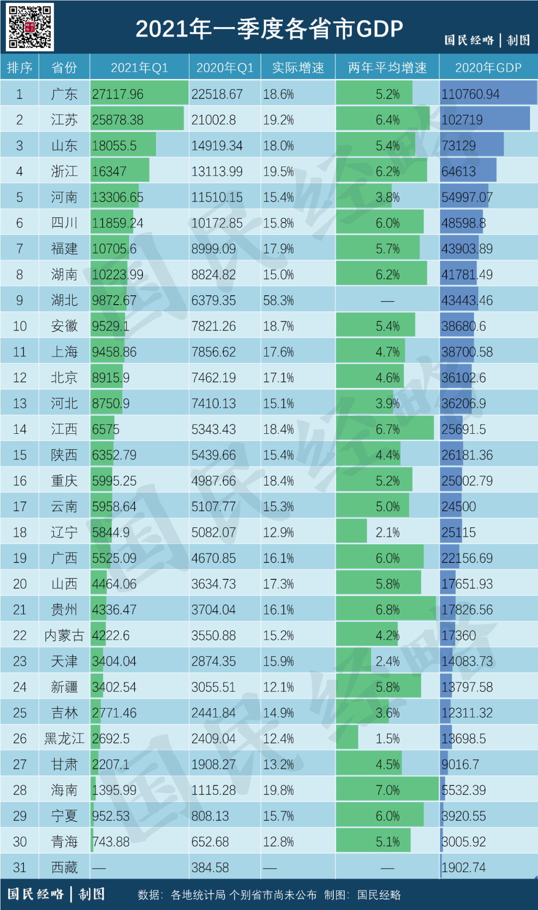這是2021年一季度中國內(nèi)地31個(gè)省市GDP數(shù)據(jù):