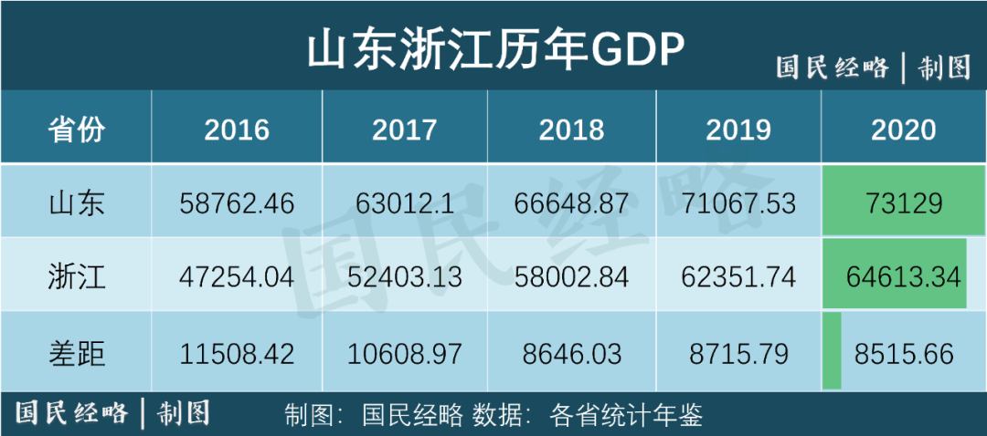 按照經(jīng)濟(jì)普查之后的數(shù)據(jù),2016-2020年,山東與浙江的GDP差距分別是1.15萬億、1.06萬億、8646億、8715億、8515億。