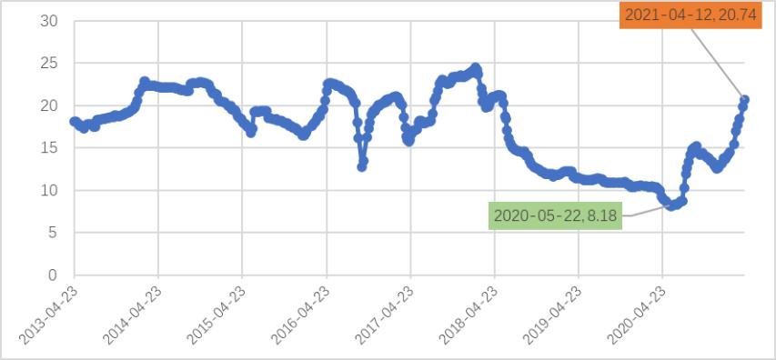 硅料是硅片成本的重要組成部分,并且隨著硅片技術的進步,硅料成本占比進一步上升。硅片企業(yè)提升供應鏈管理能力,能夠抵御上游硅料價格大幅波動是實現(xiàn)硅片企業(yè)贏得競爭優(yōu)勢的關鍵因素之一。2013年以來多晶硅價格相對比較穩(wěn)定,去年以來多晶硅價格從低位10美元/kg以下增長到20美元/kg以上,價格大幅上升給硅片企業(yè)帶來了巨大的沖擊(見圖4)。