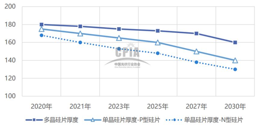 薄片化有利于降低硅耗和硅片成本,但會影響碎片率。目前切片工藝完全能滿足薄片化的需要,但硅片厚度還要滿足下游電池片、組件制造端的需求。硅片厚度對電池片的自動化、良率、 轉換效率等均有影響。2020 年,多晶硅片平均厚度為180μm,P型單晶硅片平均厚度在175μm 左右,N型硅片平均厚度為168μm(見圖6)。