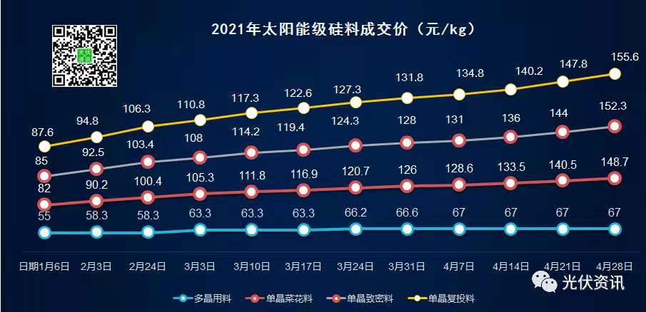 近日【光伏資訊】微信公眾號(PV-info)了解到,硅業(yè)分會發(fā)布國內(nèi)太陽能級硅料最新的成交價(jià)。上周,硅料再漲!高達(dá)147.8元/kg,本周硅料價(jià)格仍呈上漲走勢,且漲幅較大: