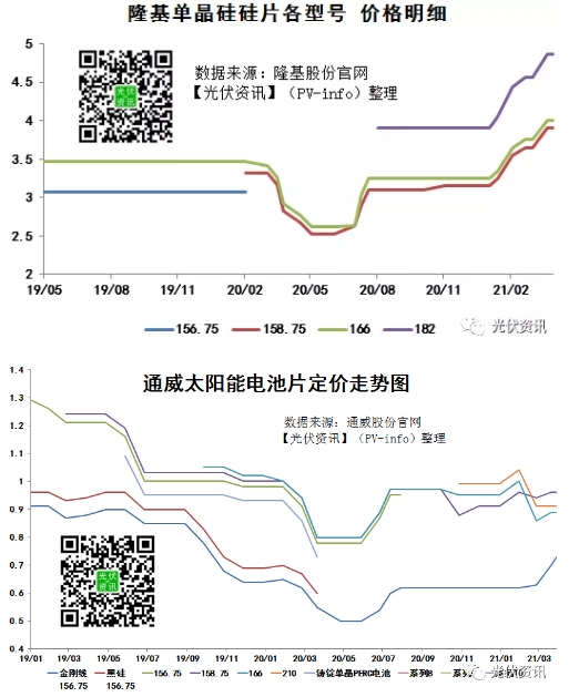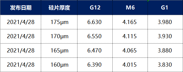 硅料價(jià)格的上漲已經(jīng)預(yù)示了硅片、電池片環(huán)節(jié)調(diào)價(jià)。2021年4月23日,隆基公布單晶硅片價(jià)格,本次價(jià)格并未上漲:隆基182硅片4.86元/片;166硅片4元/片;158.75硅片3.9元/片。