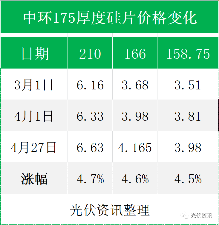 昨日,中環(huán)發(fā)布5月硅片價(jià)格:以175μm厚度的硅片為例,與4月10的報(bào)價(jià)相比 158mm、166mm、210mm尺寸分別上漲了0.17元/片、0.185元/片、0.3元/片。