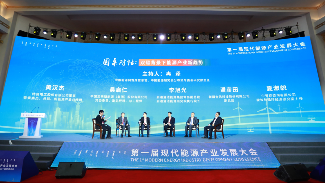 在本次大會的圓桌對話環(huán)節(jié),中國能源網(wǎng)首席信息官、中國能源研究會分布式專委會研究部主任冉澤,特變電工股份有限公司董事、黨委委員、總裁、新能源產(chǎn)業(yè)總經(jīng)理黃漢杰,中國三峽新能源(集團)股份有限公司黨委委員、副總經(jīng)理、總工程師吳啟仁,啟迪清潔能源集團常務(wù)副總裁、啟迪清潔能源研究院執(zhí)行院長李旭光,新疆金風科技股份有限公司副總裁潘彥田,中節(jié)能咨詢有限公司能效與循環(huán)經(jīng)濟研究室主任夏淑貌共同探討了“雙碳背景下能源產(chǎn)業(yè)新趨勢”。