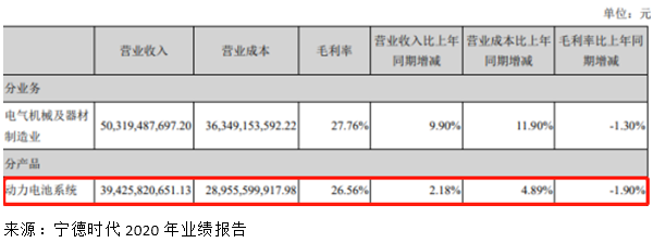 另外,寧德時代年報還顯示,其海外市場電池銷售收入2020年毛利率達到32.69%,而同期國內(nèi)市場毛利率只有26.84%。