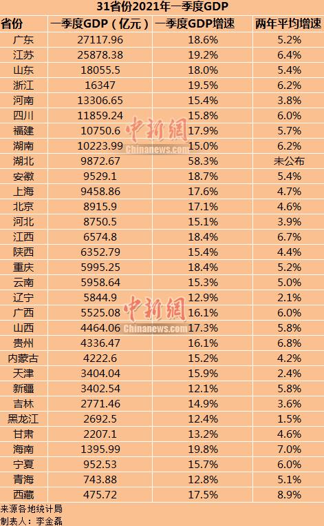 31省份一季度GDP增速均為兩位數(shù),湖北以58.3%的增速排第一;8個(gè)省份GDP增速跑贏了全國(guó)GDP增速;兩年平均增速方面,西藏排名第一。廣東一季度GDP總量超過(guò)2.7萬(wàn)億元,排名第一。安徽一季度GDP趕超上海,擠進(jìn)全國(guó)十強(qiáng)。