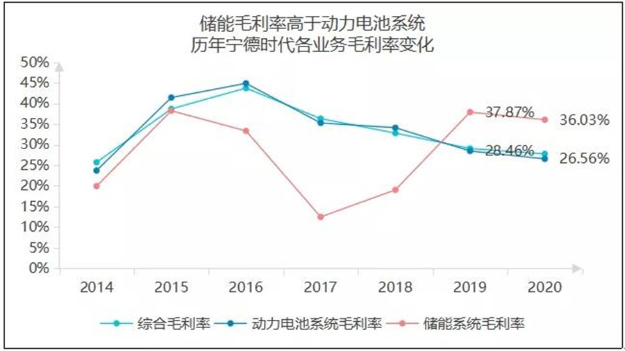 2019年和2020年,動(dòng)力電池系統(tǒng)的毛利率為28.46%和26.56%,而儲(chǔ)能系統(tǒng)的毛利率分別為37.87%和36.03%。