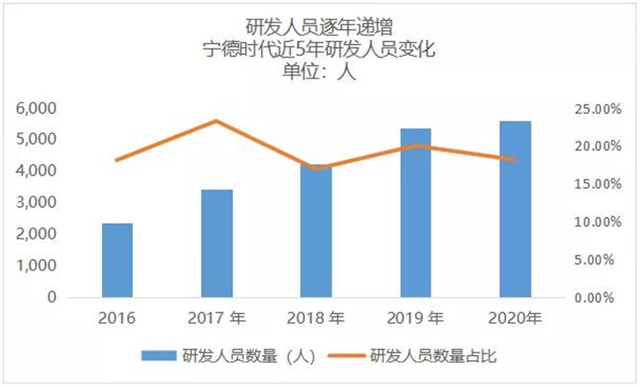 2020年,寧德時(shí)代研發(fā)在營收中的占比達(dá)到7.09%,擁有研發(fā)技術(shù)人員5592 名。