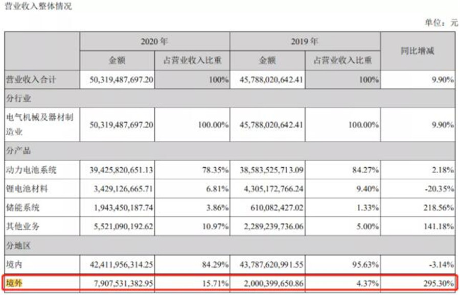 2020年,寧德時(shí)代境外業(yè)務(wù)營收為79.08億元,營收占比達(dá)到15.71%,而2019年這一數(shù)字僅為4.37%,同比大增295.30%。