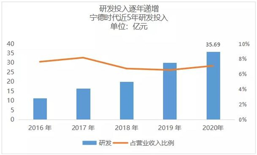 在營業(yè)收入大幅增長的同時(shí),寧德時(shí)代的研發(fā)投入不僅沒有降低占比,而且呈現(xiàn)出增長的趨勢(shì)。