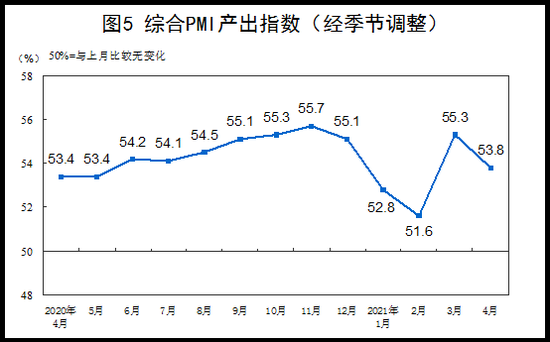 4月份,綜合PMI產(chǎn)出指數(shù)為53.8%,比上月回落1.5個(gè)百分點(diǎn),表明我國(guó)企業(yè)生產(chǎn)經(jīng)營(yíng)活動(dòng)總體擴(kuò)張力度減弱。