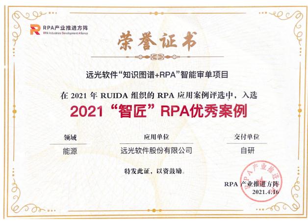 本次峰會由中國信息通信研究院(以下簡稱“中國信通院”)、中關村數(shù)智人工智能產(chǎn)業(yè)聯(lián)盟主辦,RPA產(chǎn)業(yè)推進方陣(RUIDA)承辦。峰會面向銀行、證券、保險、能源、制造、互聯(lián)網(wǎng)、教育、零售、醫(yī)藥等多個行業(yè)公開征集RPA應用案例,并對評選出的優(yōu)秀案例進行表彰。通過行業(yè)專家評審、公開票選等層層評選,遠光軟件申報的“知識圖譜+RPA”智能審單項目案例脫穎而出,榮獲“2021‘智匠’RPA優(yōu)秀案例”獎。