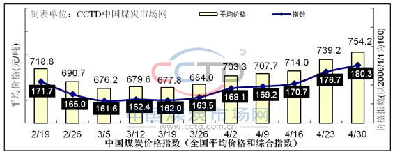 CCTD環(huán)渤海動力煤現(xiàn)貨參考價在本周期內(nèi)整體保持先穩(wěn)后漲趨勢。截止到4月30日,5500K現(xiàn)貨價格報價為799元/噸,對比上期(4月23日)上升了15元/噸。